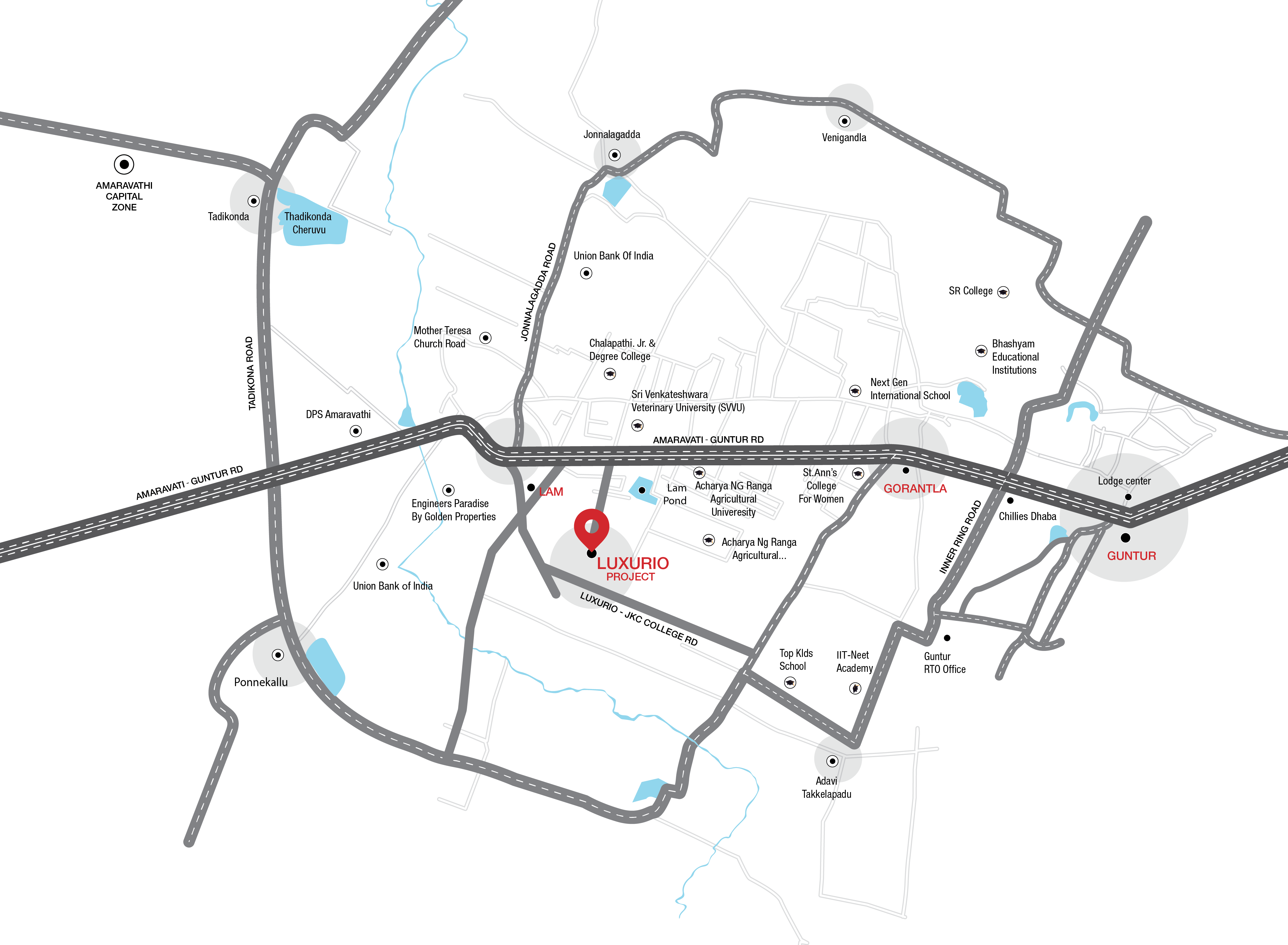 Luxurio offers an ideal location for peaceful living and prosperous growth, nestled near the capital city of Amaravati at LAM, just 4 km from the inner ring road, Guntur. Positioned perfectly for both serenity and city convenience, it is close to essential amenities like schools, hospitals, and a peaceful temple. Its prime spot along the Guntur-Amaravati route provides seamless access to both cities, making it an excellent choice for commuters and families seeking tranquillity with connectivity.